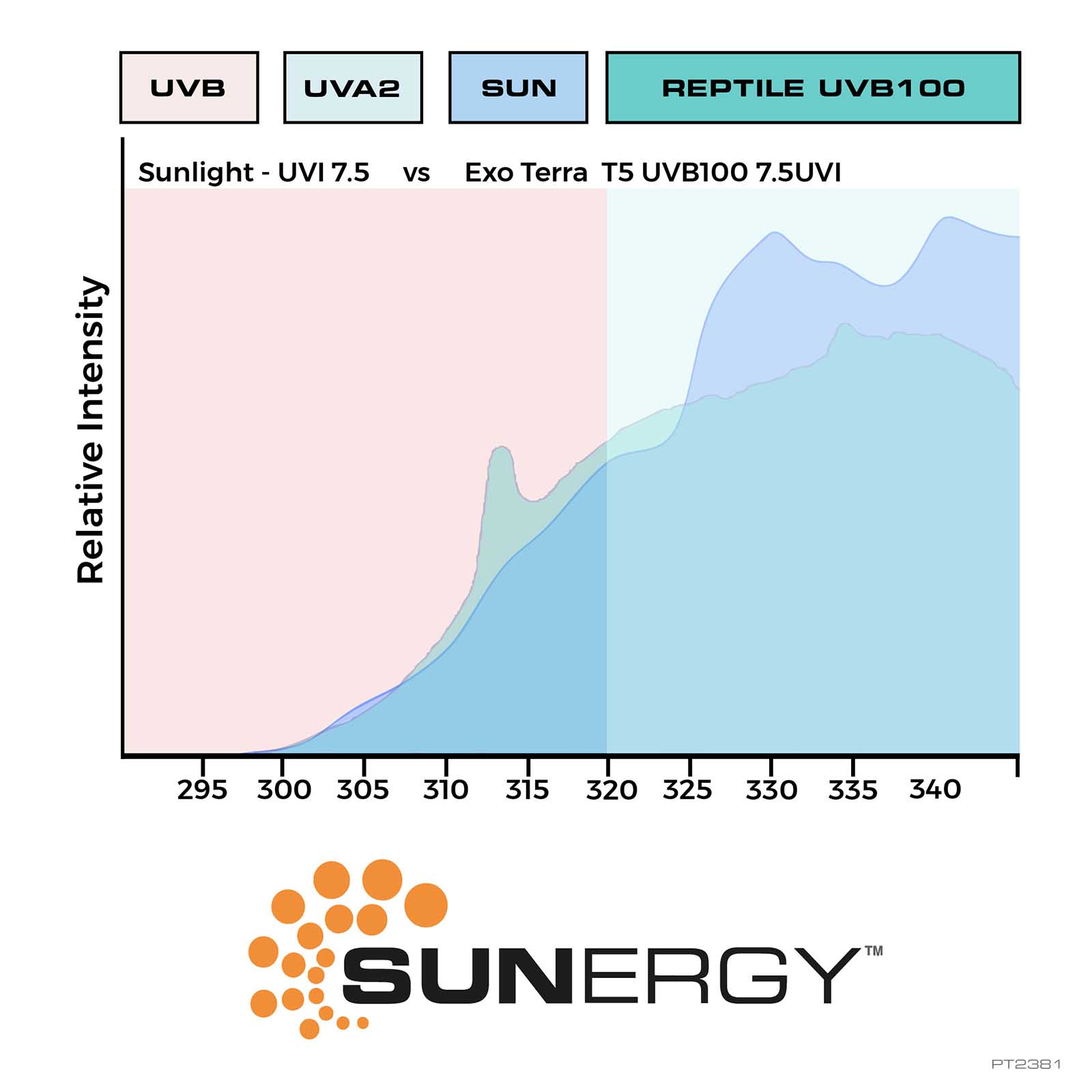 The innovative Sunergy™ phosphor blend sets Exo Terra’s Reptile UVB T5 lamps apart. Sunergy™ is a state-of-the-art phosphor blend developed using German precision technology to replicate the energy spectrum of the sun, particularly in the UV range. This cutting-edge blend comes closer to natural sunlight than any other lamp on the market and is designed to meet the highest standards, delivering unmatched quality and performance. With Sunergy™, Exo Terra’s Reptile UVB T5 lamps provide reptiles with the UVB they need for health, vitality, and natural behavior.