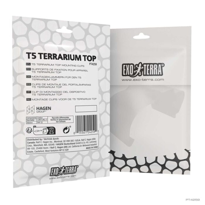The Exo Terra® T5 Terrarium Top Mounting Clips allow you to install the T5 Terrarium Top inside any wooden vivarium or terrarium with perforated aluminum ventilation strip. Installing the T5 Terrarium Top on the inside of the terrarium ensures that no light and UV radiation is lost because it is filtered through the perforated aluminum ventilation strip that is located between the lamp and the animal.